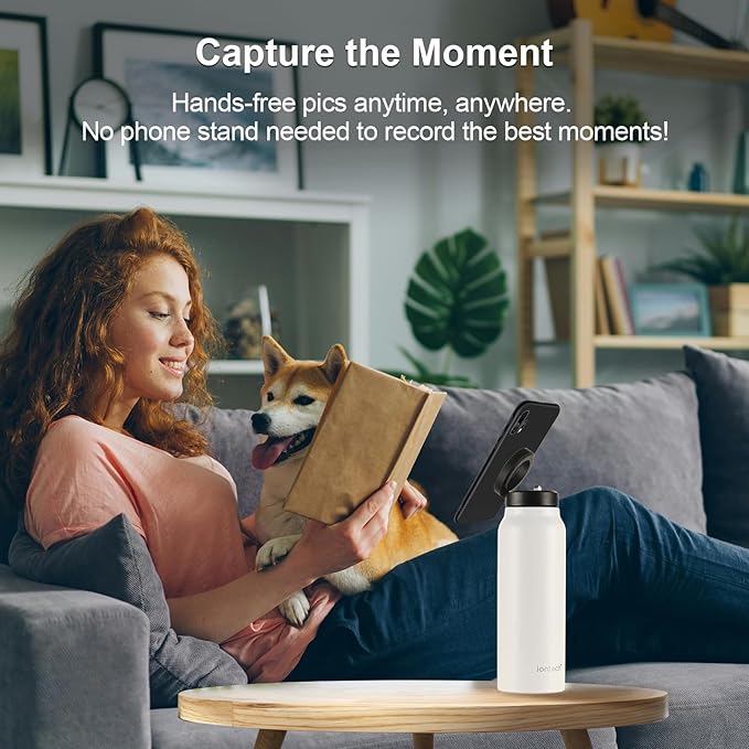 - Water Bottle with Magnetic Phone Holder: This newly designed durable insulated stainless steel water bottle features a built-in magnetic ring mount that securely and conveniently holds your phone, whether the bottle is empty or full. The ring tripod also functions as a carry handle, making it perfect for your daily use and essentials for your travel needs