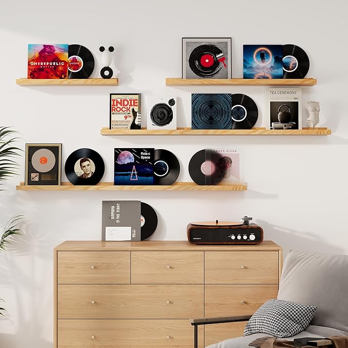 • Picture Ledge Design: Ideal for displaying photos, artwork, small plants, or collectibles, these shelves feature a thoughtful ledge design with a subtle lip and a shallow groove behind it. This design securely holds items in place while maintaining a clean, modern look.