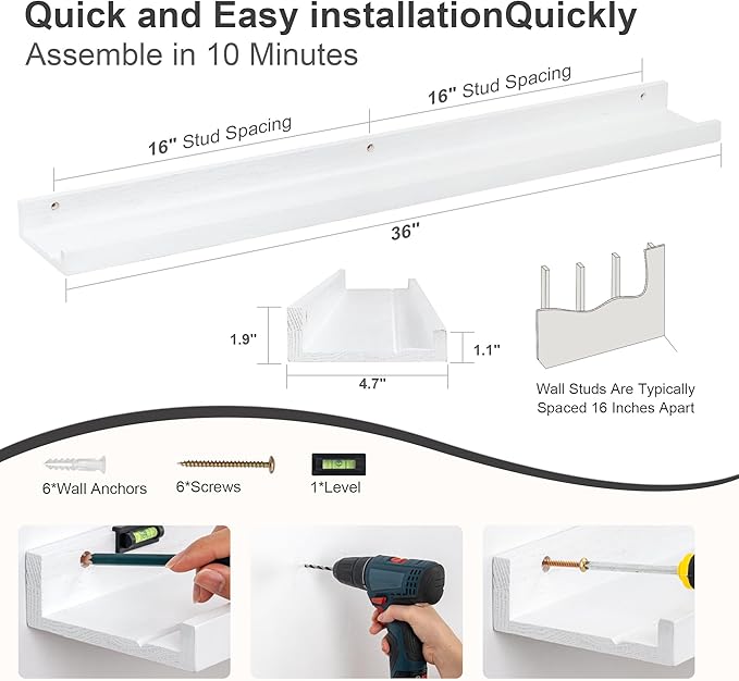 - Picture Wall Collage Decor: If you have dozens of pictures but don't know how to display them, FLYJOE picture ledge shelves(especially large size) for wall are perfect for you! With our hanging shelves, store and display different types and size of photo frames in one place with no worries of falling off.