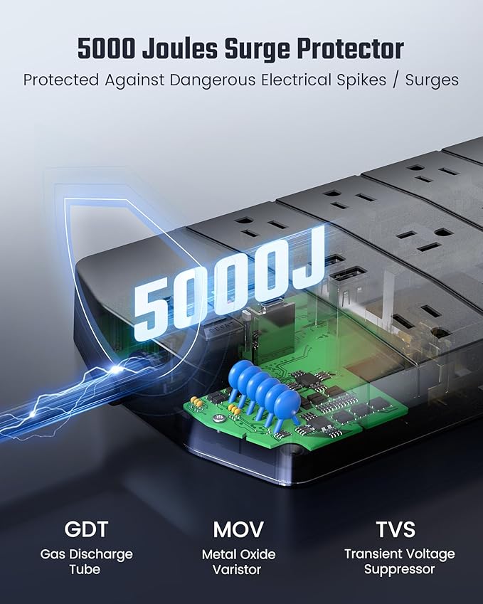 - 5000 Joule Surge Protector: With industrial-grade massive 5000 joules of surge protection, the built-in surge protector offers you peace of mind, safeguarding your valuable electronics from potential power surges and voltage fluctuations. The surge protector has LED indicators to let you know whether your devices are safe