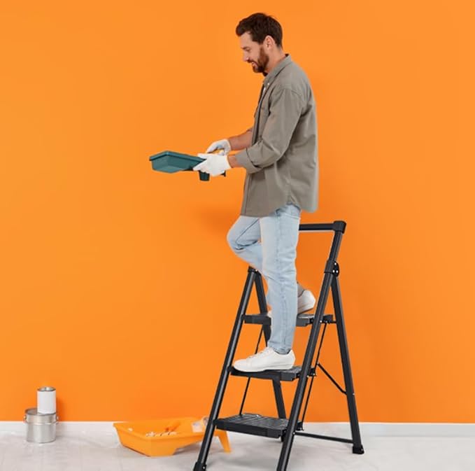 - Security and Stability: The 3-step ladder was constructed out of high-strength ultra wide and thick steel pipe, strong bearing beam, trangle strenghten support, and sturdy connection structure to ensure the ladder stronger and more durable, good oxidation resistance and corrosion resistance