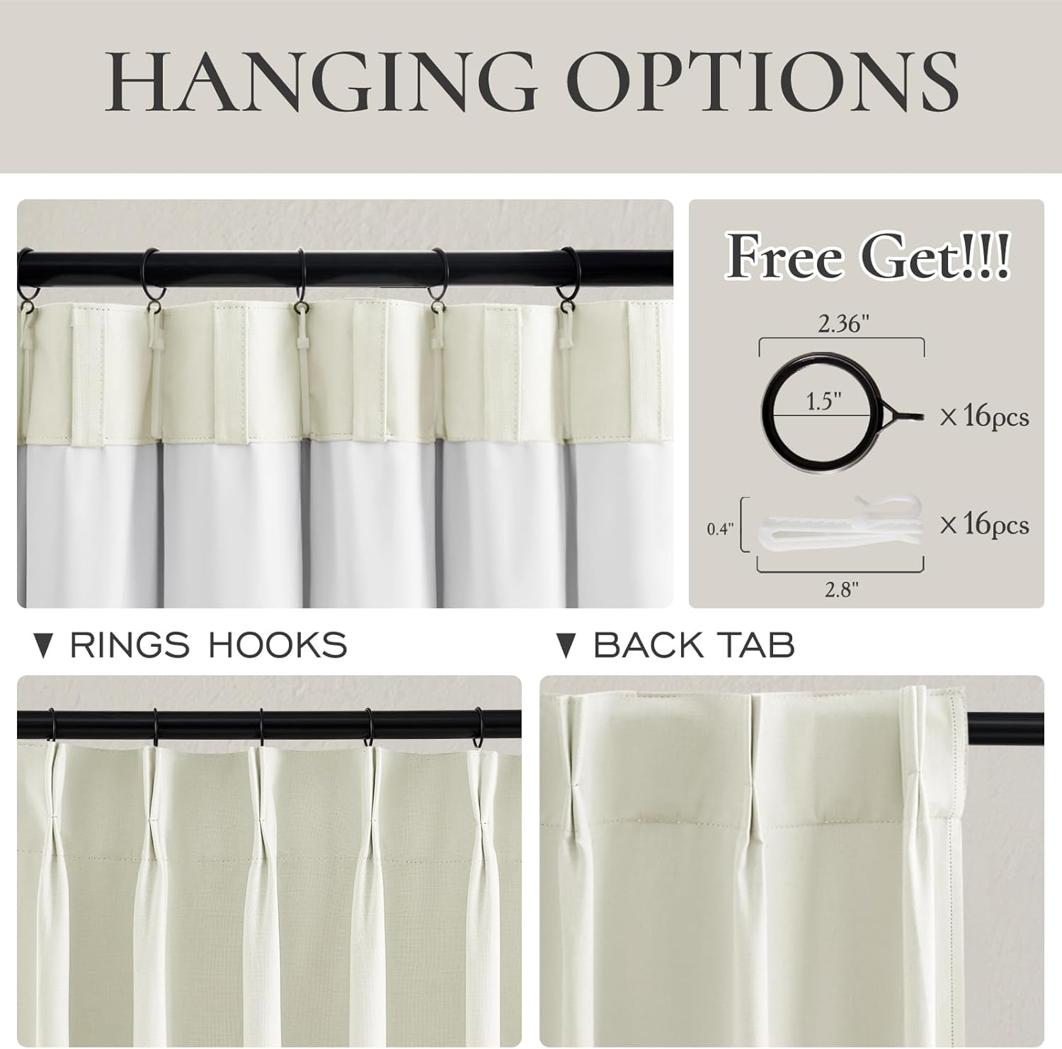 - Ready Made:Set of 2 pinch pleated curtain panels per package with 16 metal rings and 16 adjustable plastic hooks(The adjustable hook can raise and lower the height of the curtain by 1 inch),Each panel measures 40"W x 120"L,pair measures 80"W x 120"L