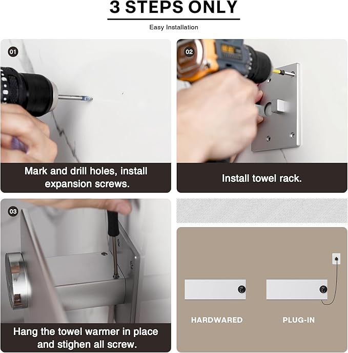 - [Easy 3-Step Installation]: Support both plug-in and hardwired installation.Follow the instruction manual, it only takes you 3-4 steps to finish the set-up. Available in various sizes and colors, it's versatile enough for bathrooms, kitchens, or any area needing quick drying