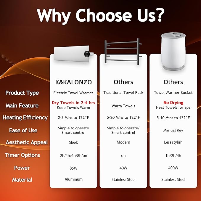 - [Premium Aerospace Aluminum Build]: Crafted from aerospace aluminum with delicate construction, K&Kalonzo electric towel warmer combines durability with a sleek, chic design. It's waterproof and anti-scalding, making it a safe and stylish addition to any space