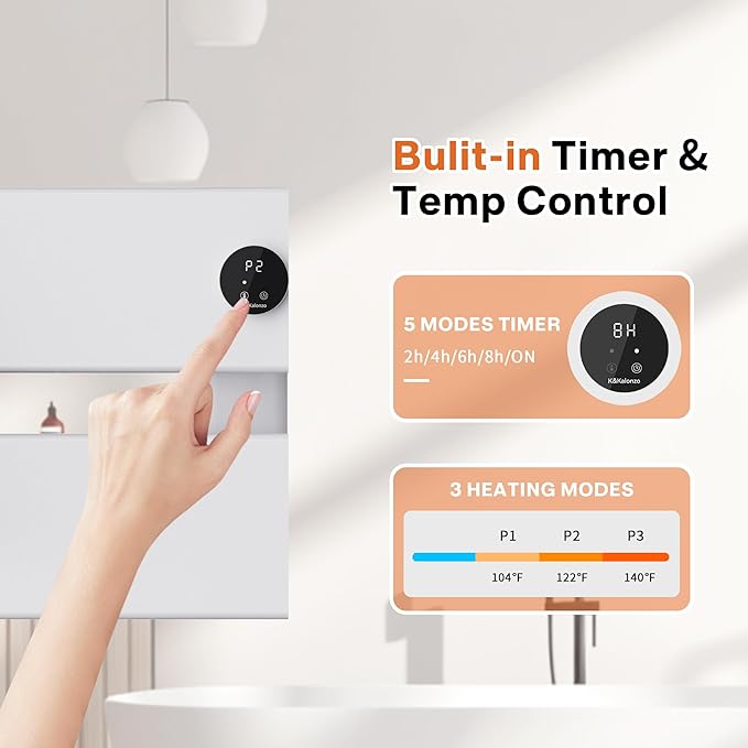 - [Customizable Timer & Temperature Settings]: Featuring 5 timer options (2h/4h/6h/8h/on) and 3 temperature levels (about 104°F, 122°F, 140°F), this towel warmer adapts to your schedule and heating preferences, providing flexibility for different needs