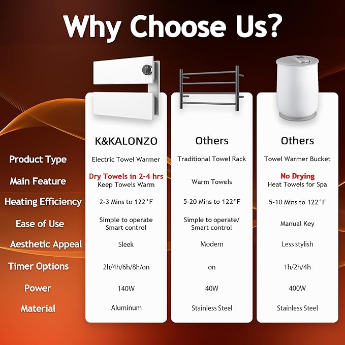 - [Premium Aerospace Aluminum Build]: Crafted from lightweight aerospace aluminum, K&Kalonzo electric towel warmer combines durability with a sleek, chic design. It's waterproof and anti-scalding, making it a safe and stylish addition to any space