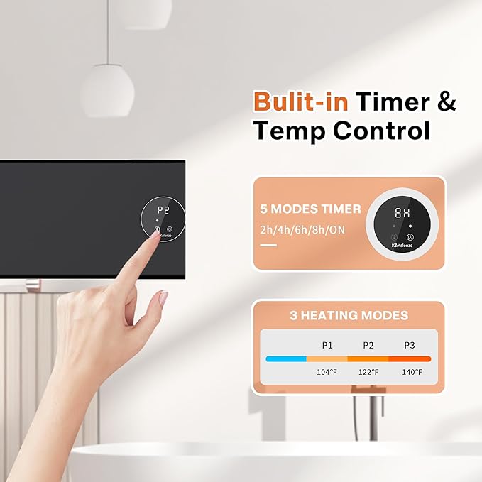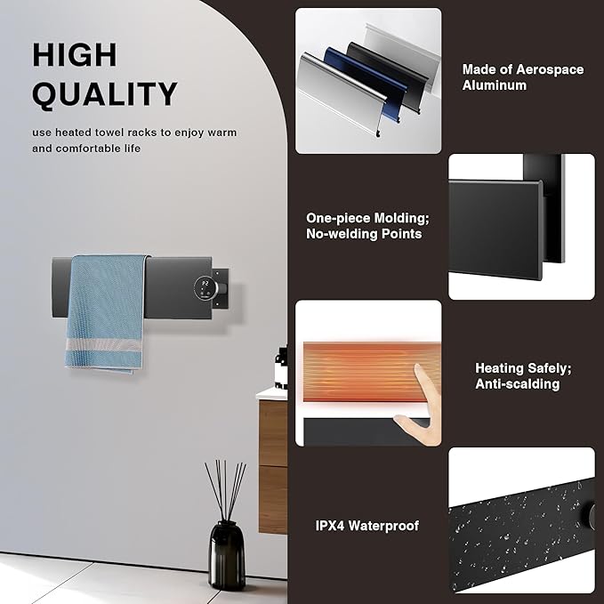 - [Rapid Heating Technology]: Reaches your desired temperature in just 1-3 minutes! The heated towel rack heats up to 122°F in around 2 minutes, and 140°F in around 3 minutes. Anti-scalding panels ensure safe handling, even at high temperatures