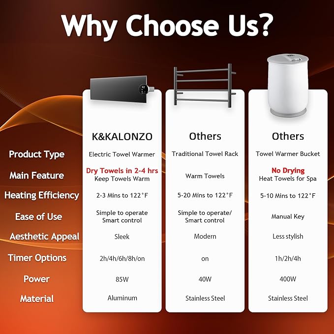 - [Premium Aerospace Aluminum Build]: Crafted from lightweight aerospace aluminum, K&Kalonzo electric towel warmer combines durability with a sleek, chic design. It's waterproof and anti-scalding, making it a safe and stylish addition to any space