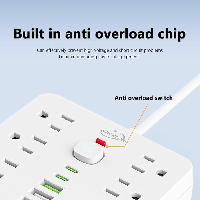 - đĄď¸ăMultiple Security ProtectionăJouleLoom 17in1 power strip integrates an 8-point safety system, including surge protection, fire resistance, overload protection, temperature control, and more. It has overload protection and will light up red during normal operation. When overloaded, the power switch will automatically trip to protect the equipment. Press the switch to restore. It ensures complete safety for you and your devices, whether at home or in the office, for long-lasting and stable operation.