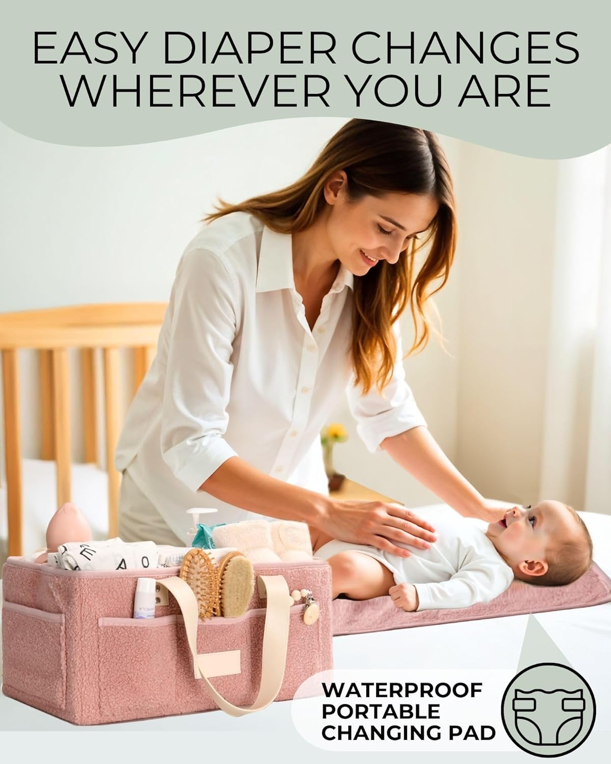 Baby Diaper Caddy Organizer with Portable Changing Mat - Teddy Fleece Diaper Organizer for Changing Table - Basket for Changing Essentials - Baby Essentials Organizer with Removable Dividers