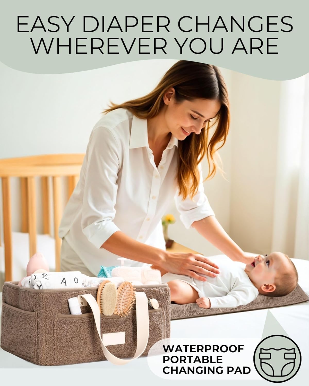 Baby Diaper Caddy Organizer with Portable Changing Mat - Teddy Fleece Diaper Organizer for Changing Table - Basket for Changing Essentials - Baby Essentials Organizer with Removable Dividers