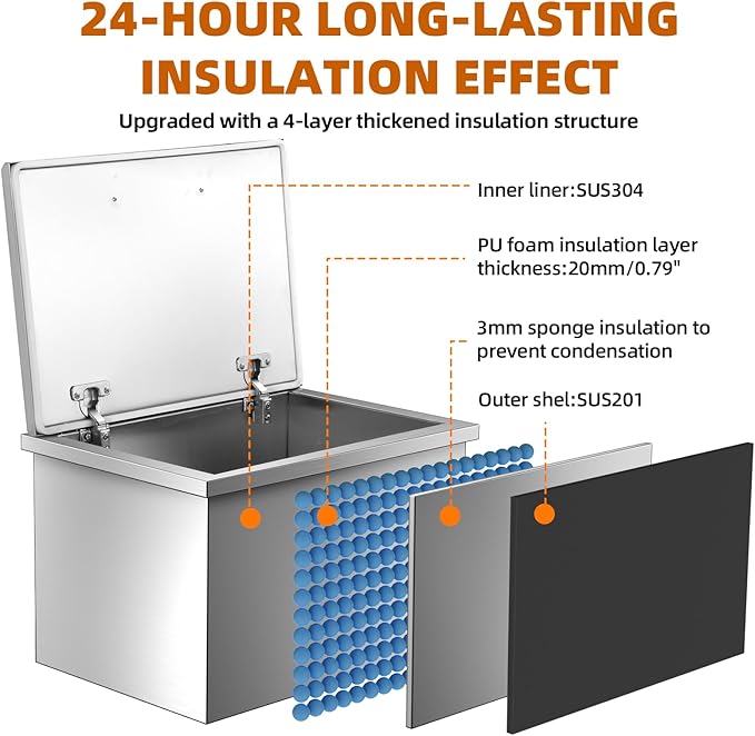 - Stainless Steel Construction: Made from high-quality food-grade 304 stainless steel, this ice chest is durable and easy to clean. The double-layer design and high-density insulating rubber interior keep your ice cool for extended periods.