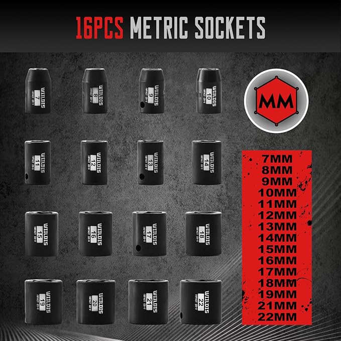 - Versatile&Useful: This impact socket set features 26 shallow pieces, including 10 SAE sockets from 5/16" to 7/8" and 16 metric sockets from 7 mm to 22 mm. This set is ideal for any mechanic shop