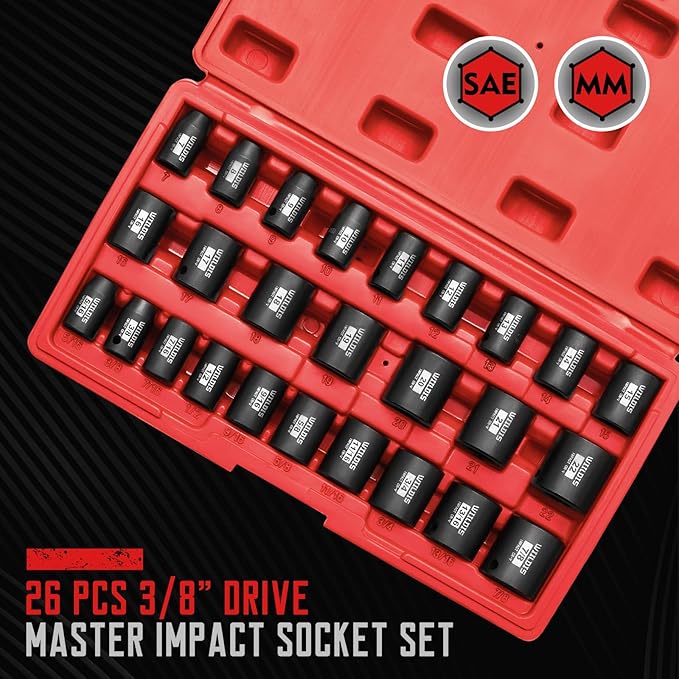 26 PCS 3/8" Drive SAE and Metric Impact Socket Set, SAE 5/16” to 7/8", Metric 7mm to 22mm, Premium Cr-V Steel, 6-Point Hex Designt,Cr-V Steel