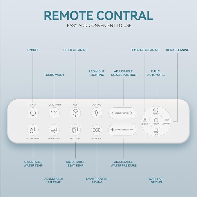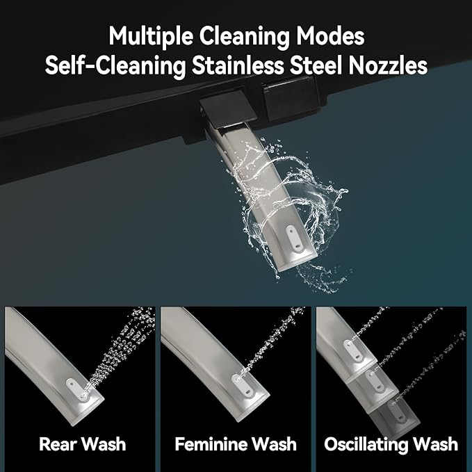 - STAINLESS STEEL NOZZLE: The electric bidet offers rear cleaning, female cleaning with adjustable nozzle position. It's also self-cleaning, and you'll never have to worry about cleaning the bathroom bidet again.