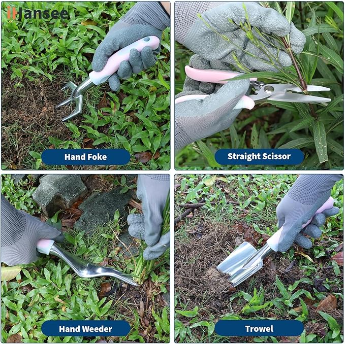 - Durable and Rust-Resistant Tools: Crafted from aluminum alloy, iHansee gardening tools are lightweight yet strong, offering long-lasting durability and rust resistance. Each tool has an ergonomic concave-convex handle made of PP+TPR for a comfortable grip. Designed to reduce strain on wrists and hands, the handles provide excellent leverage for digging, planting, and weeding.