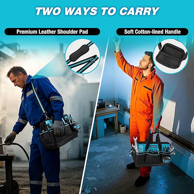 - Two Carrying Options: Equipped with a comfortable handle and a leather-padded shoulder strap, this portable tool bag offers two convenient carrying styles: hand-carry or crossbody. The handle is lined with cushioning, and the shoulder strap has a soft leather pad to reduce fatigue, even during long workdays