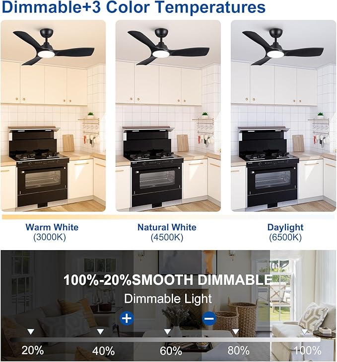 - 【Ceiling Fans with lights Remote】Ceiling Fans with lights and a Remote Control function. With a remote control at the touch of the button, you can turn your ceiling fan on or off and Adjust the speed and LED Color temperature and Timer function from anywhere in the Indoor, Bedroom, Living Room, Kitchen, Boys Room, Patio, Farmhouse