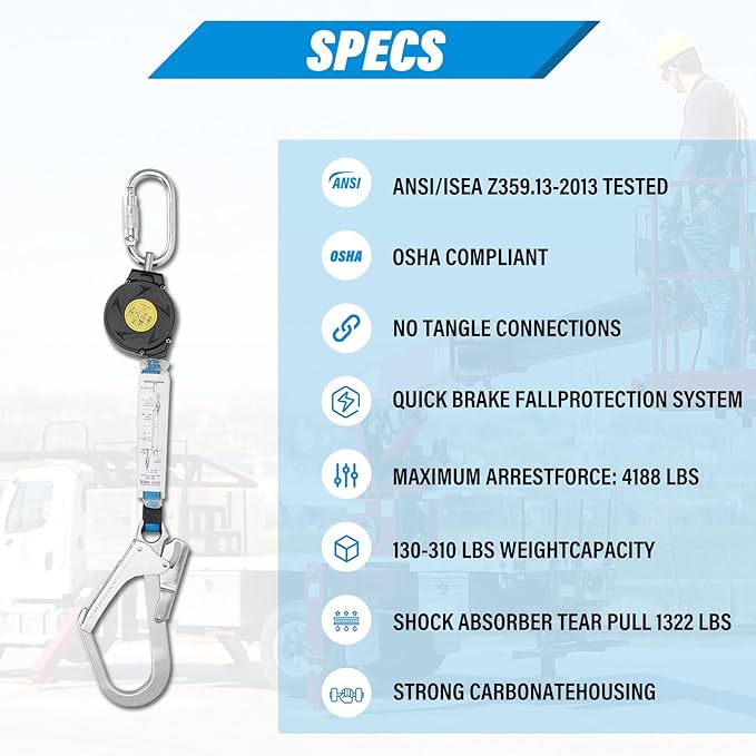 - 【High-strength polyester webbing】Our 6ft self retracting lifeline is made of high-strength polyester webbing sewn together, which features low shrinkage and heat resistance, and can be easily retracted from a lightweight, compact polycarbonate housing to ensure tension while allowing workers to move freely