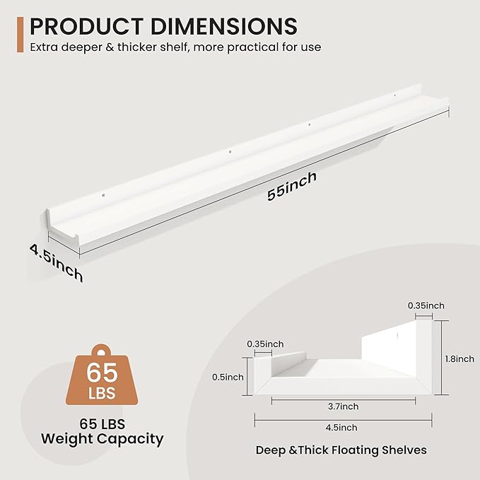 - Enhanced Stability Design: Featuring a secure lip at the front, these floating shelves prevent items from slipping or falling, confidently supporting up to 65 lbs, making these MDF wood shelves ideal for showcasing cherished items.