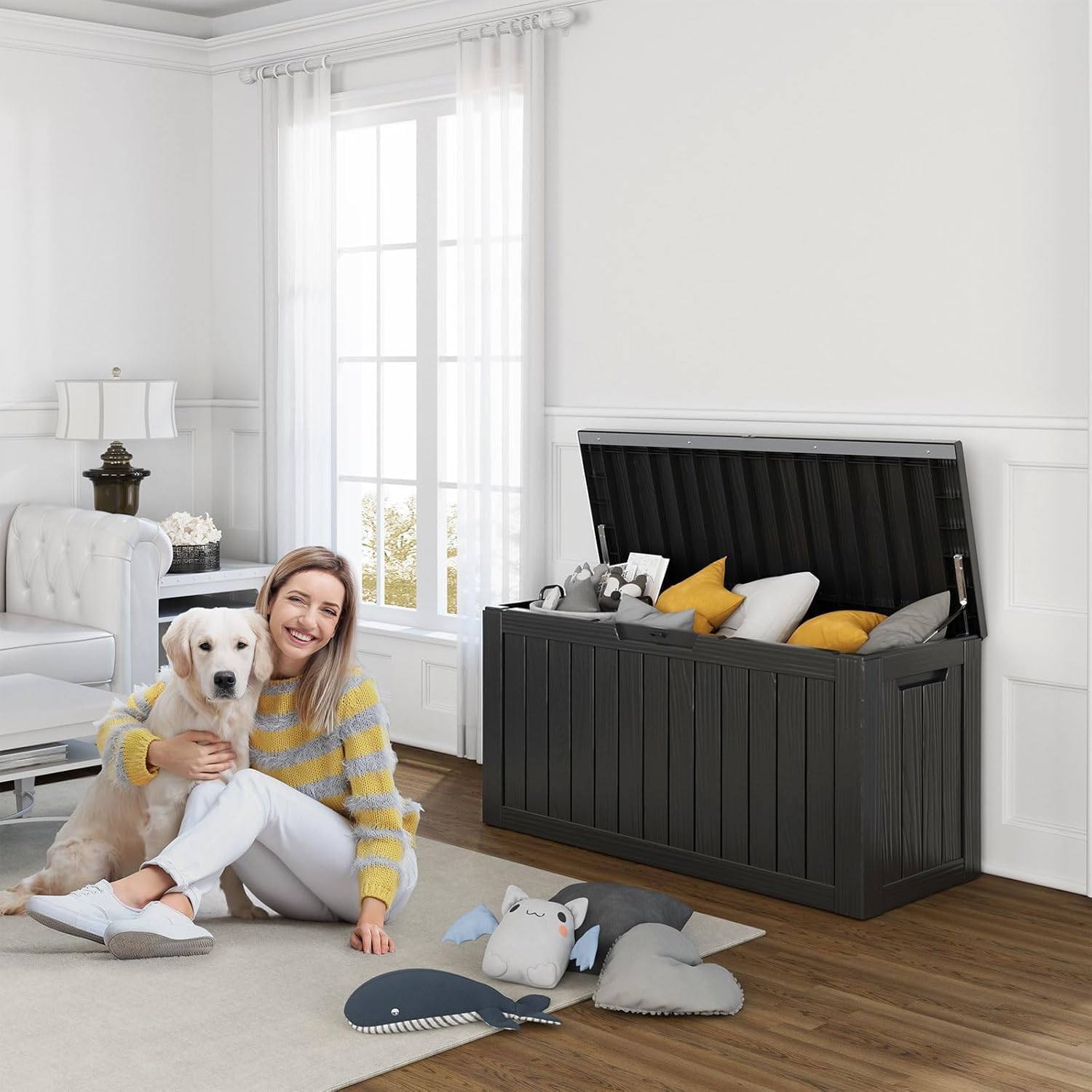 - VERSATILE IN EVERY SETTING: This patio storage box doubles as an indoor laundry organizer and an outdoor yard storage unit for cushions, garden tools, pool accessories, outdoor gear, and more, offering ample space. It can also serve as a side table, patio seat, storage bench, or footstool