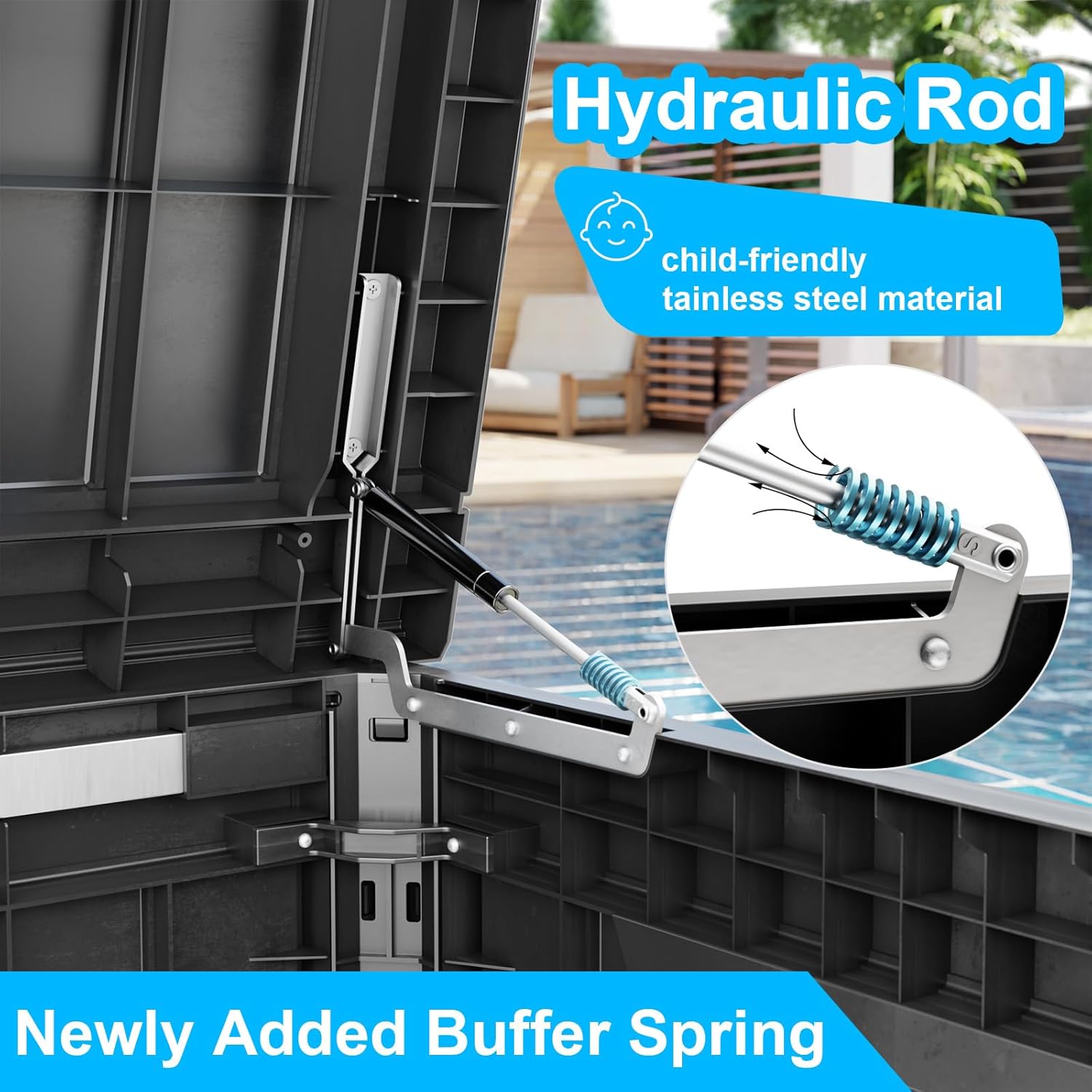 - Safety design: Each deck box has lockable holes (not included) for added security; in addition, the box is equipped with a hydraulic stand, which allows easy opening and slow closing and prevents hand pinching. The outdoor waterproof deck box has built-in handles on both sides, ensuring easy grabbing and moving