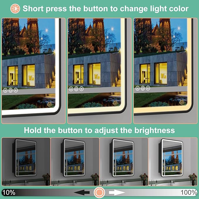 - 【3 Color & Brightness Adjustable LED Light】LED medicine cabinet mirror for bathroom has 3 color light, short press the on/off button for 3 light mode adjustments, cool light, natural light, and warm light. Long press the dimmable button for step-less adjustment of light brightness from 10%-100%