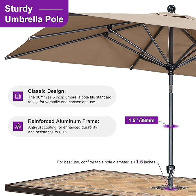 - Classic Design: This patio umbrella elegantly fits any table with an umbrella hole.