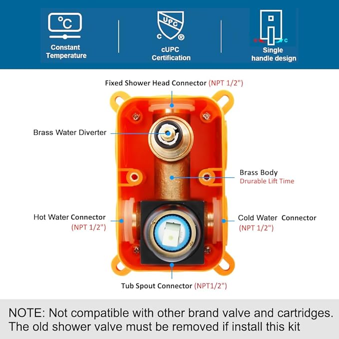 - IMPORTANT WARNING: Not compatible with other brand‘s shower faucet valve and cartridge. The old shower valve must be removed if install this kit.