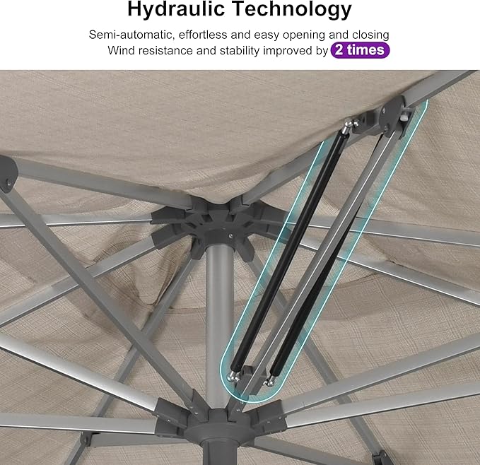 - Semi-Automatic Opening and Closing Function: The patio umbrella has gas springs inside the ribs to help open and close with less effort. Pulling the “open” tab helps open it, while pulling the close button closes it quickly and smoothly.