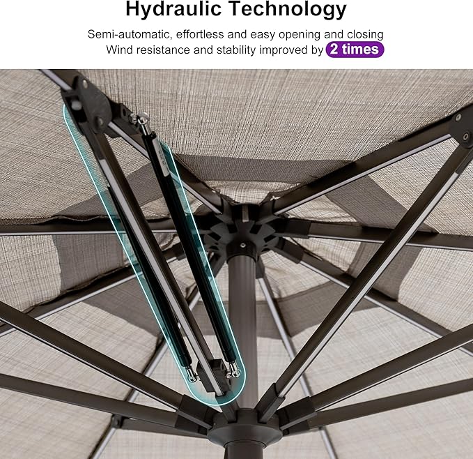 - Semi-Automatic Opening and Closing Function: The patio umbrella has gas springs inside the ribs to help open and close with less effort. Pulling the “open” tab helps open it, while pulling the close button closes it quickly and smoothly.