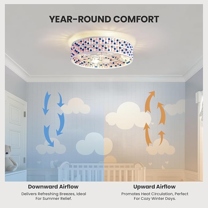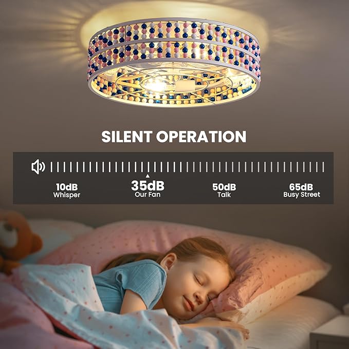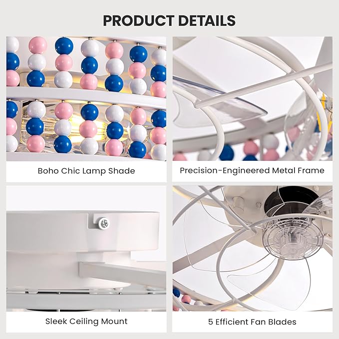 - Patented Boho Design: This innovative ceiling fan combines a Bohemian aesthetic with a functional light fixture, featuring handcrafted wooden beads that form a circle shade. Pink, blue and white wood beads are used, and the overall style is lively and fresh