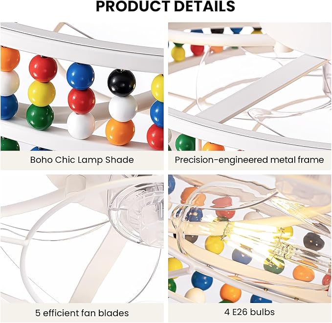 - Patented Boho Design: This innovative ceiling fan combines a Bohemian aesthetic with a functional light fixture, featuring handcrafted wooden beads that form a circle shade. The use of a variety of colors of wood beads, the overall style of lively and fresh