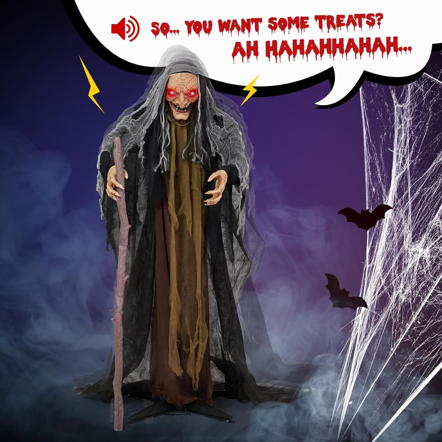 AW Animated Halloween Decorations,Scary Witch with Crutch,5.3FT Life Size Standing Clown,Motion/Sound Activated LED Eyes Creepy Sound,Haunted House Props Party Outdoor Indoor Lawn Yard Patio 2025