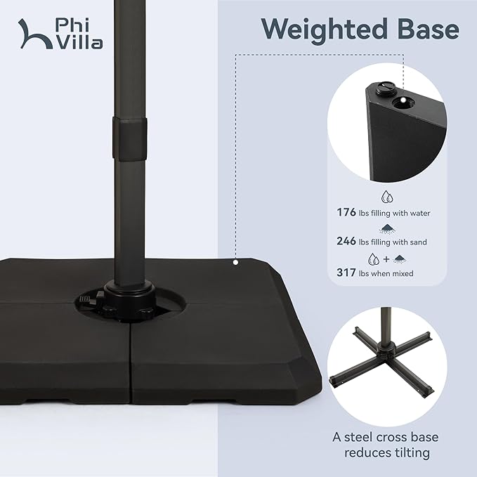 - Cantilever Umbrella with Base Included: PHI VILLA this umbrella includes a heavy-duty cantilever offset patio umbrella stand square base plate set with easy-fill spouts for water or sand
