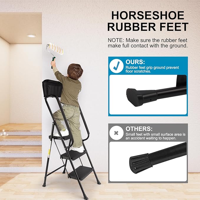 - HANDY TOOL BAG: 3 step safety ladder with handrails attachable an tool bag , included for holding all your work necessities such as screwdrivers, plyers, pencils, and nails, to keep materials at your fingertips. Can hold paintbrushes, tape measures, or a bottled beverage for added convenience, eliminating the need to repeatedly go up and down. A great handyman or painting ladder.
