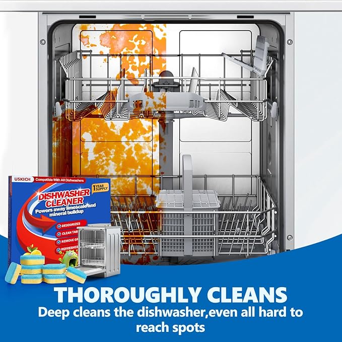 - Heavy Duty Cleaning: The deep descaling formula effectively removes scale, grimy mineral build-up, grease, stains, and odors. Dishwasher cleaner and deodorizer can penetrate deep into the tub, racks, pump and valve, drain and recirculation hoses of the dishwasher to remove all the deeply ingrained grime,making your machine shiny and new.