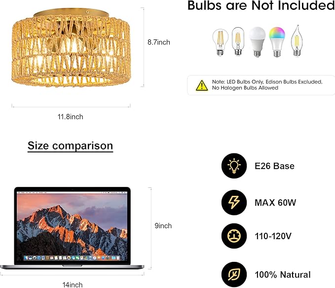 - Bulb Requirements: Rattan ceiling light fixture requires 3*E26 bulb (60W max, bulb not included).LED bulbs preferred. Compatible with LED, CFL, Incandescent.It is recommended to avoid Edison or Halogen bulbs. If you want a dimming effect, you will need dimmable bulbs and a dimmable switch (not included)