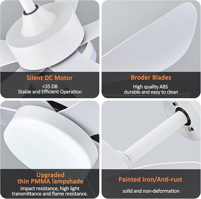 - Ceiling Fan Air Circulation:RHEAFON white ceiling fan with light built in reversible DC moto,A energy efficent and quiet. Bring you cooling in summer and warm air in winter. Combining curved blades give you strong wind from 1-6 speed.