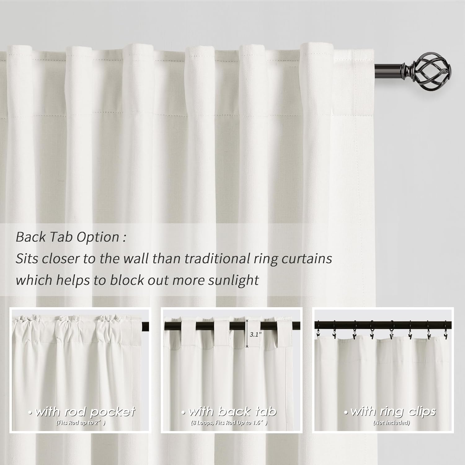 - 3 Hanging Options: Differ from the traditional curtains with grommet, BOODII linen curtains with back tab and rod pocket can full block sunlight fully. (1) Using the back tabs design to create an elegant pleated look and sit closer to the wall than traditional ring curtains, which helps to block out more sunlight; (2) Using rod pocket for a classic effect; (3) Using clip rings on track system or curtain rod, slide open/closed easily (clip rings are not included).