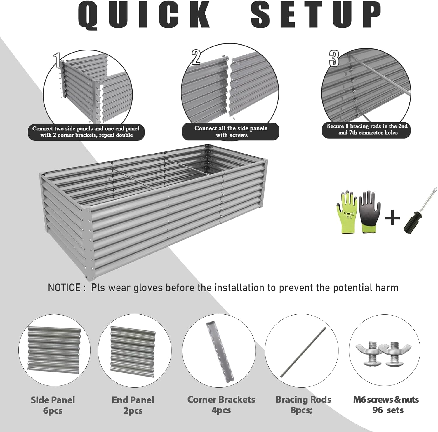 - 【Safety Features】①Anti-rust Coating, do not contaminate soil, safe for plants and humans; ②Rectangular shape, the raised planter box has no sharp corner; ③Thickened crimped edge design, no sharp edges, smooth to the touch; ④ Gloves included; will not hurt your hand when installing or planting