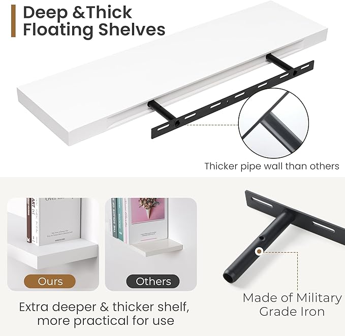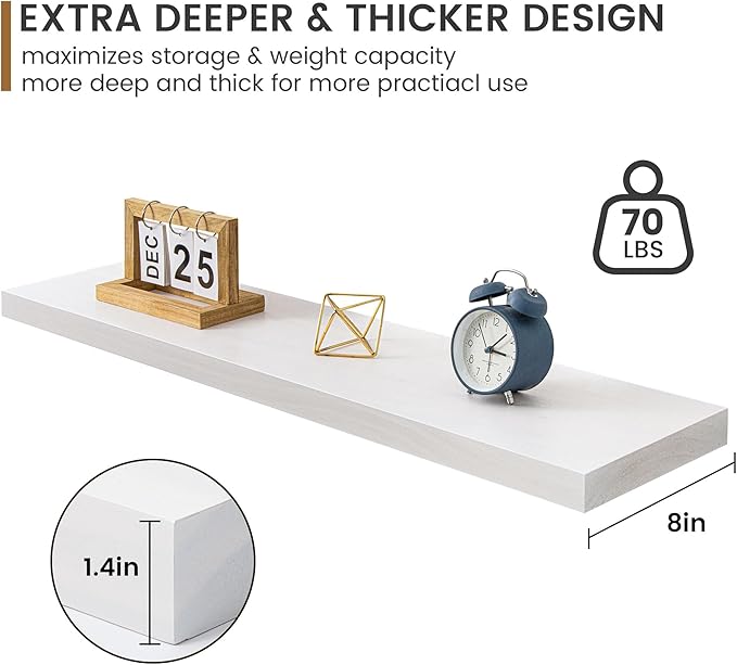 - Extra Deeper & Thicker for Storage - Each board measures 30"W x 8"D x 1.4"H. Extra deeper and thicker design in order to bring maximizes storage space and weight capacity, even hold up to 70 lb. This floating shelf taking up zero square feet, reduces clutter and highlights décor in compact spaces. It can help make full use of the empty wall, making it much more space-saving and making your room look larger and tidier.