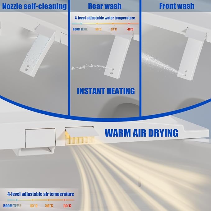 - Elevate cleanliness with self-cleaning nozzles and bidet toilet seat warm water technology. The nozzles maintain freshness with a pre-and post-use rinse, helping keep the surface in optimal condition, while the 4 water pressures let you choose a gentle cleanse (ideal for kids) or a thorough wash (great for post-surgery). Plus, this bidet with dryer adds the final touch: 4 warm air settings that dry you off quickly, cutting down on toilet paper use. It's a level of freshness that feels like a spa – right in your bathroom.