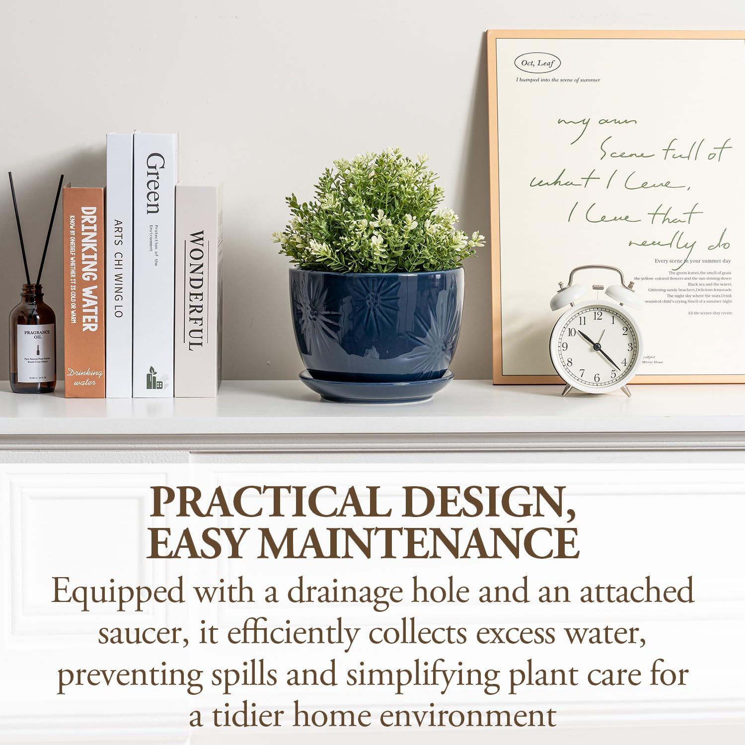 - Modern blue ceramic empty pot with embossed sunburst design, drainage hole and attached saucer dish provides a sophisticated home for any houseplant