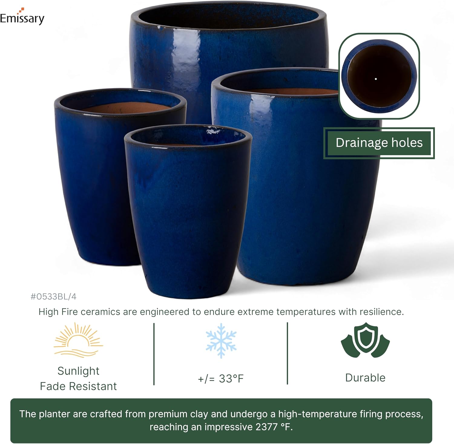 Emissary Home and Garden Bullet 12in., 14in., 15.5in., 21in. H Blue Ceramic Round Planters with Drainage Hole (Set of 4)