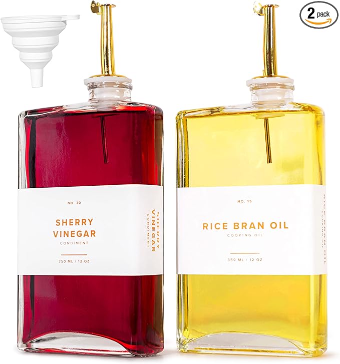 - ELEGANT GLASS OIL DISPENSER FOR KITCHEN: This premium oil and vinegar dispenser set includes two 17oz glass oil bottles for kitchen, designed to keep your favorite oils and vinegars fresh while adding a sleek touch to your kitchen.