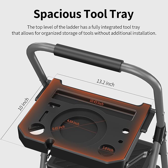 - Convenient tool platform:The 4 step folding ladder features an oversized tool tray, ready for use without any additional setup. It holds all your essential tools, reducing the need for frequent trips up and down the ladder, making your tasks more convenient and efficient.