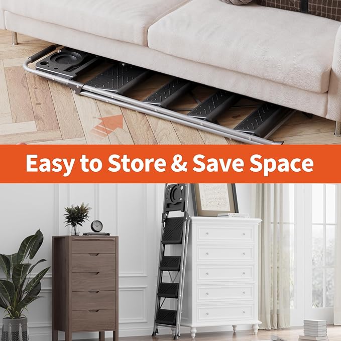 - Portable and Space Saving: This folding step stool folds to just 3 inches, making it easy to store against walls, in corners, under beds, or in closets. Made from high-quality lightweight steel, it's easy to carry with just one hand.