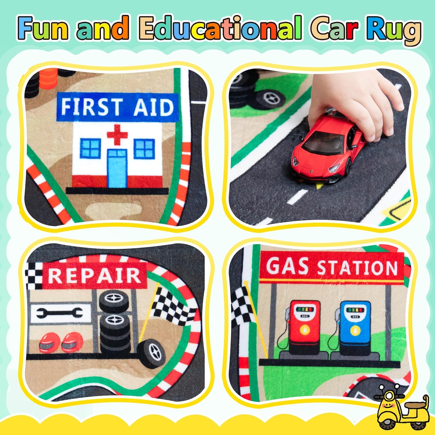 - [Unique Design]: This race track rug features a realistic 3D cascading surround route, complete with a start, and Finish line markings. The car rug is perfect for kids who enjoy playing with race cars. The vibrant colors enhance indoor play, creating an exciting outdoor experience at home.