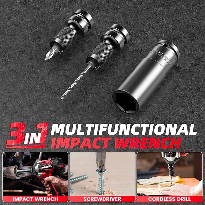 - 【3-in-1 Multi-Functional Impact Wrench Upgrade】-- OnlyinNY impact Wrench doubles as an impact drill and screwdriver, perfect for furniture assembly, DIY woodworking, and demanding tasks like heavy equipment maintenance, construction projects, agricultural machinery, trucks, and RV repairs. A trusted ally for professional mechanics and DIY enthusiasts—and an ideal gift for family and friends!cordless impact wrench